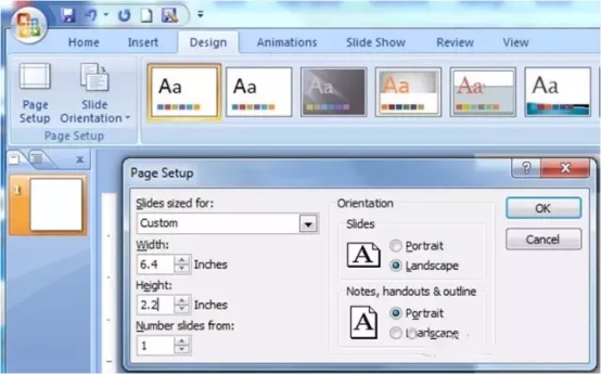 1.首先要决定图版的大小,这需要综合考虑每个图表多大能让读者看得清楚,以及期刊对图版的尺寸的要求。在我们的例子中,我们希望每个图表是3英寸宽,2英寸高,左右排列,这样最终的图版我们可以设成6.4*2.2 inch. 新建一个powerpoint文件,layout设成空白,在Design/Page setup处设置slide size为6.4*2.2,方向为landscape。