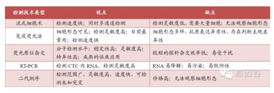 图 :CTC 分析方法一览 利用免疫亲和或物理特性法可富集到CTC,接下来还需要结合有效的下游分析方法。一方面,由于目前CTC 捕获技术不能保证百分之百的纯度,需要对所得到的细胞进行鉴定,以进一步确定CTC 细胞的数目,以减少CTC 数目判定的假阳性率和假阴性率。另一方面,在肿瘤的发生发展过程中,不仅CTC 的数目在动态的变化,CTC 所携带的分子标志物也在变化,通过对CTC 表面标志物检测,能够反应肿瘤发生发展的动态变化,是研究肿瘤发生发展机制的有效策略,并能很好地指导临床治疗。常用的CTC 检测技术如免疫荧光、PCR、FISH 及高通量测序等。 表 :CTC 检测技术比较