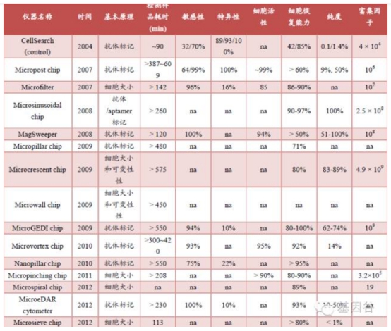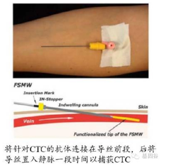 图 :植入静脉的CTC 微流控技术(2012 年) 第一代的CTC 芯片是一种基于微流体学的CTC 检测技术。它在一张与标准载玻片尺寸相同的硅片上面覆盖大量微柱,每一个微柱都包被上能够捕获CTC 的抗体。当血液样品通过微流芯片时,这些微柱确保CTC 在流过芯片前捕获它们。这种设计不仅制造困难,而且成本昂贵,且微柱周围的血流通畅性限制了与抗体覆盖微柱接触的CTC 数量。 第二代芯片在增加血液样本处理量的同时,提高了捕获罕见循环肿瘤细胞的能力。第二代芯片将微芯片安装在标准载玻片上,利用标准的病理检测方法对癌细胞进行鉴别,而且捕获的循环肿瘤细胞还可用于其他检测或用于培育。 第二代芯片在第一代芯片的基础上癌细胞的捕获率提高了25%,可捕捉血液样本中超过90%的癌细胞。第一代的CTC芯片是一种用于捕获罕见循环肿瘤细胞(CTCs)的设备。与第一代CTC 芯片相比,第二代的HB 芯片制作更为简单,且可更高效地捕获肿瘤细胞,提供全面且易于获取的数据。后人在第二代的的基础上加上了aptamer(结合CTC 表面的EpCAM),进一步提高的CTC 的捕获效率。 另一种是体内富集法。将结合EpCAM 的装臵从前臂静脉插入病人体内,并停留30min,从而进行体内CTC 富集。 表 :CTC 检测仪器比较