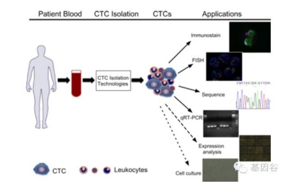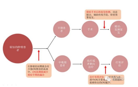 (备注:aptamer 是一种单链DNA 或RNA 分子,与目的蛋白有很高的亲和力和特异性;敏感性:是指在合理条件下使用时,给予仪器的参数能够被有意义测得的最小单位。灵敏度越高,仪器能够在越低的CTC 浓度下检测到CTC。特异性:检测到的细胞是CTC的概率。细胞活性:指CTC 在被仪器处理后的生物活性。保留足够的生物活性对于后续的检测非常重要。细胞恢复能力:CTC 在被仪器处理后能够存活并培养的概率,对于后续的细胞培养和耐药性检测很重。富集因子:指仪器对CTC 的富集能力,值越高,富集能力越强) 从上面的对比表格我们可以看到,近年来,已经有大量基于芯片设计的CTC 分离富集仪器,而且已经有大量CTC检测仪器在灵敏性,特异性和富集后的细胞活性上超过了Cell Search 平台。相比于第一代检测仪器,芯片富集具有成本低,细胞活性高,便于后期分析的特点。由于医疗器械进入临床应用实行“双通道制”,所以FDA 批准并不是判断CTC 检测仪好坏的唯一标准。通过FDA 认证有助于产品在市场上的推广和销售;没有通过FDA 的批准,但是产品在获得CLIA 认证的实验室依然可以被用于临床。对于CTC 检测仪器,我们建议主要还是要关注仪器对于CTC 检测的灵敏度,准确性和富集后肿瘤细胞的活性。从对比来看,微流控芯片技术将是未来CTC 检测的主流技术。 CTC 应用场景