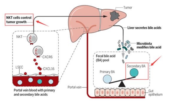 师兄见天给大家带来的就是Gut bacteria,发表在Science上的重大发现:肠道微生物可以通过调控胆汁酸(bile acids)招募NKT细胞到肝脏,抑制肝癌(HCC)细胞的生存。