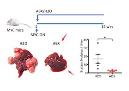 作者通过给MYC基因突变(肿瘤模型)的小鼠喂食水和光谱抗生素(ABX),来检测肠道微生物的存活对于肝癌发生发展的影响,如图所示,ABX杀死了肠道微生物,同时发现肝癌的增殖明显被抑制。